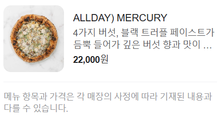 머큐리 피자! 비건 분들이 오시면 선택할 수 있는 옵션인데 비건 아니라도 충분히 즐길 수 있는 피자예요.