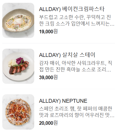 저희는 4명이 가서 여기 메뉴에는 안 나와 있지만 3인 세트 (샐러드+파스타 택1+피자 택1+디저트+음료3잔)에 피자 하나를 더 추가해서 먹었어요.
